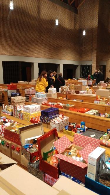 In den beiden Tagen der Entgegennahme verzeichneten wir ein stetes Kommen von Spenderinnen und Spendern, die uns liebevoll gepackte Weihnachtspäckchen zur Verteilung an unsere großen und kleinen Familien, Senioren und Alleinerziehenden überbrachten. Unsere Ehrenamtlichen hatten alle Hände voll zu tun, um die Herzensgaben in Empfang zu nehmen, nach Größe zu sortieren und in den Kirchenbänken von St. Hedwig so zu verteilen, dass die Ausgabe an die 750 Privathaushalte kurz vor Weihnachten reibungslos von statten gehen konnte.